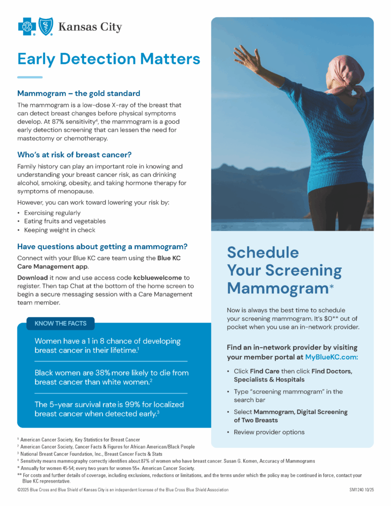 Encourage your employees to schedule their $0 copay screening mammogram – Please share our Early Detection Matters flyer via print, email, or intranet.